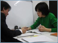 自分はですね、ちょっと孫さんに特注を、特別注文レッスンをお願いしてるんですが、1時間という時間配分の中で最初の15分くらいを、ほんとに普通の会話、先週にあった出来事であったり、家庭のことであったり、仕事のことであったり、新聞のことであったり、まったくレッスンと関係ないプライベー トの話を15分くらいやって、その後にレッスンをやってもらうと。そのレッスン中でも、孫さんはこういう言い回しをするといいんじゃないの?とか、レッス ンにない教えを受けたりするんですね。それを自分でノートにまとめて、次のレッスンの時に意識的に使ったりします。そういうことをやってますね。