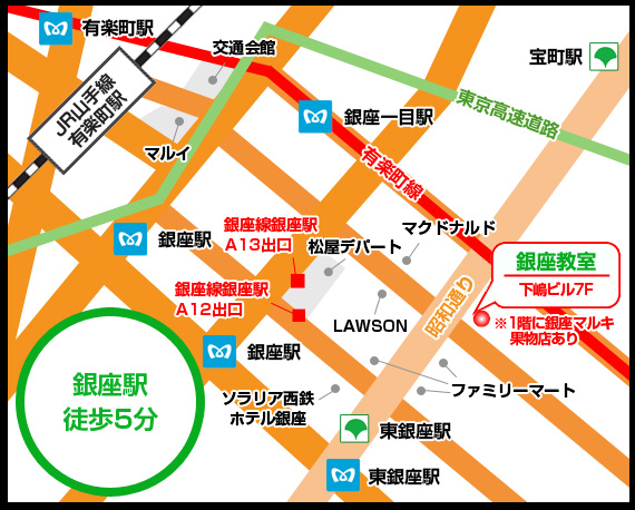 東京メトロ銀座線 銀座駅A13出口を出て右折松屋デパートを過ぎ銀座2丁目交差点を右折まっすぐ歩き、昭和通り銀座東2丁目交差点を渡り、まっすぐ20m先左側に下嶋ビル7階です。(1階に銀座マルキ果物店あり)・・・・・徒歩5分 ※完全予約制ですので、初めての方も必ず事前にご予約ください。