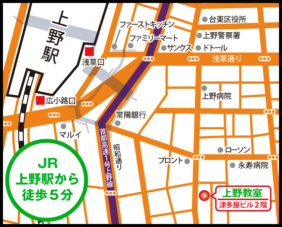 上野教室のビル(津多屋ビル)は1階が肉屋さんなので目印にしてください。ビルの隣はパチンコのショールームになっています。 ※完全予約制ですので、初めての方も必ず事前にご予約ください。
