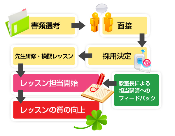 語学のレッスンにおいて一番大切なものは先生であり、先生の質は「レッスンの品質」だと考えています。先生採用の条件は「ネイティブであること」「日本語が話せること」「学歴が大学以上であること」としていますが、一番大切なのは「教える力」と「人としての魅力」と考えています。 また、当教室の中国人先生は全員女性としています。その理由は発音が聞き取りやすいこと、雰囲気が柔らかなこと、女性の方が会話を進めやすいことなどが挙げられます。